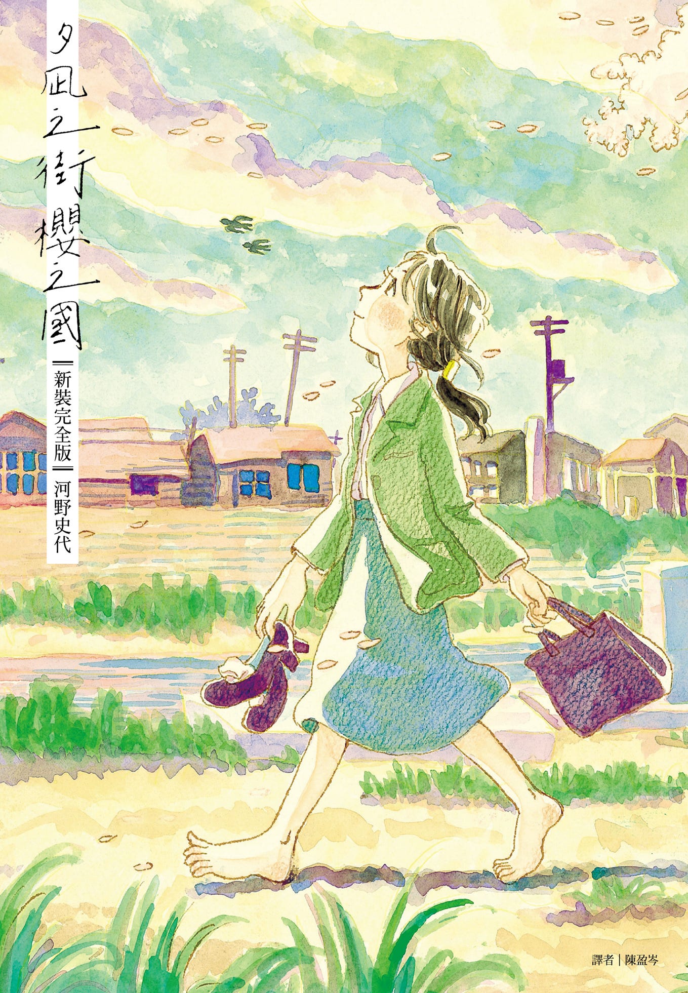 看看《夕凪之街櫻之國》的封面,是一幅淡雅水彩。女子提著鞋與公事包,赤腳抬頭走著,她身邊的河堤風光綠意盎然,她注視的天空是朦朧雲彩。你猜想這是一本什麼樣的漫畫?
