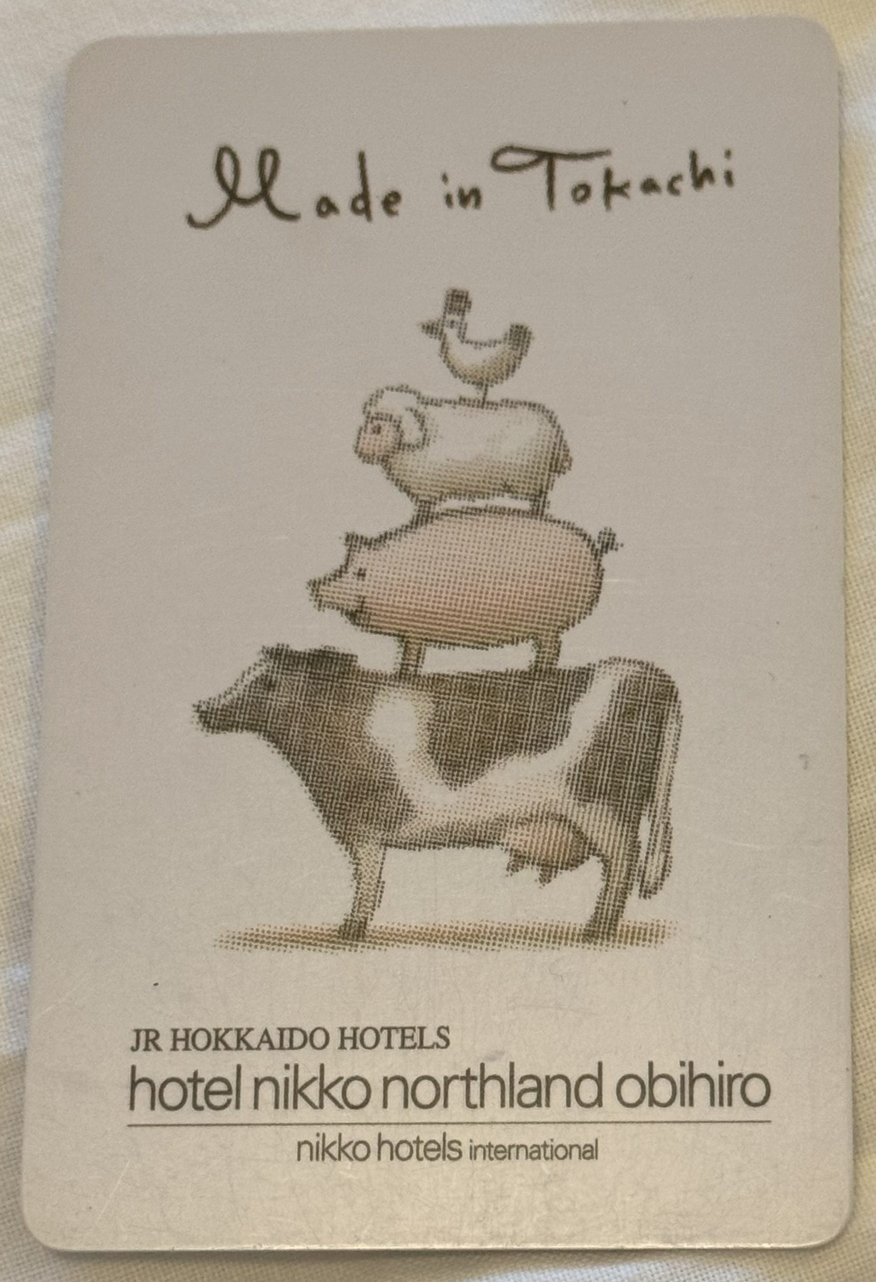 下面這張圖,是北海道帶廣站旁的「日航Northland帶廣飯店」門卡,上頭有四隻動物疊羅漢。儘管你未必知道,這四隻動物象徵著帶廣畜牧業的發達發展,但這張圖一定會讓你想起《格林童話》的「布萊梅動物樂隊」故事。