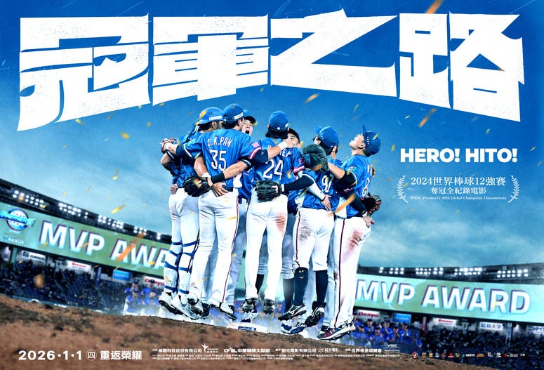 一年多前,台灣國家隊參加了2024世界棒球12強賽。一年多後的現在,紀錄參賽歷程的電影《冠軍之路》即將在明年元旦上映。它的標題已經爆雷:我們贏了,我們拿下第一次世界棒球12強賽冠軍。那麼,除了拿到冠軍,這支紀錄片還會告訴我們什麼?讓我們現在來談談《冠軍之路》。