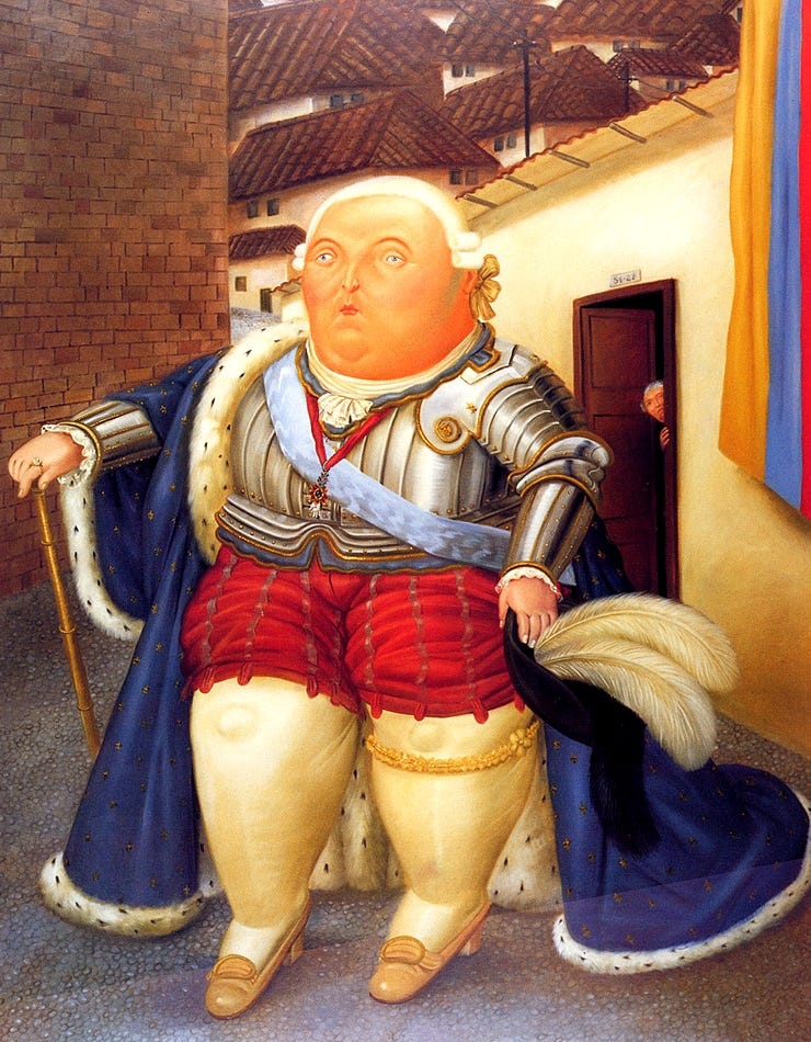 他筆下的體積感,可以是溫暖的懷抱,但也可以是尖銳的諷刺。當他畫那些軍官、總統與神職人員時,那種誇張的腫脹感,瞬間變成了一種對「權力腐敗」與「自大」的視覺抗議。而這些胖胖人物原有的呆萌幽默感,就便成了不言可喻的諷刺幽默。幽默在波特羅手上變成了雙面刃,而觀者的會心一笑,也有了兩種截然不同的意義。