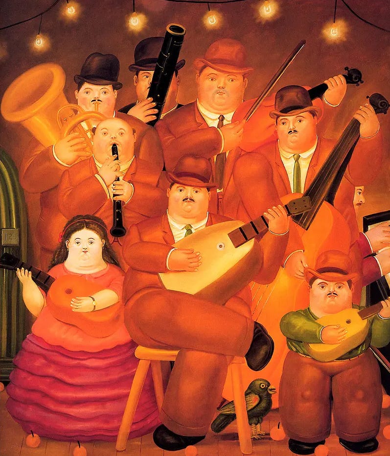 像他經典的群像畫作《音樂家》(The Musicians, 1979),你會看到畫上的九位胖嘟嘟樂手,擠在一起幾乎快撐破畫框,他們一臉淡定地拿著樂器,正臉望著觀者,他們的大腿幾乎與手中的吉他一樣粗,有人的黑管好像一根小牙籤……還有最右邊只露側臉的鋼琴手,他的左手格外粗壯。